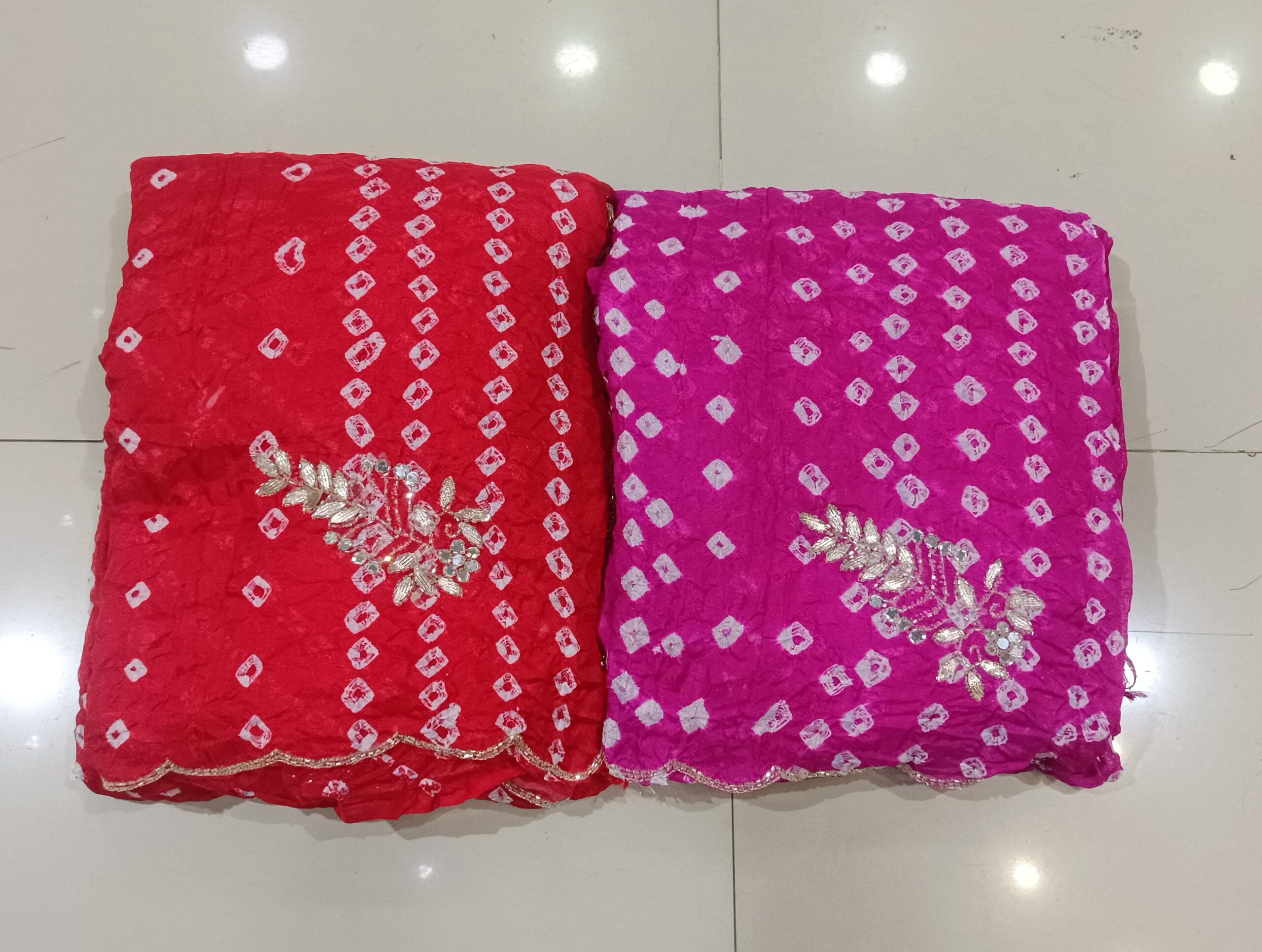 Work: Traditional Bandhej print with intricate Katdana embroidery and sequin work on the pallu.