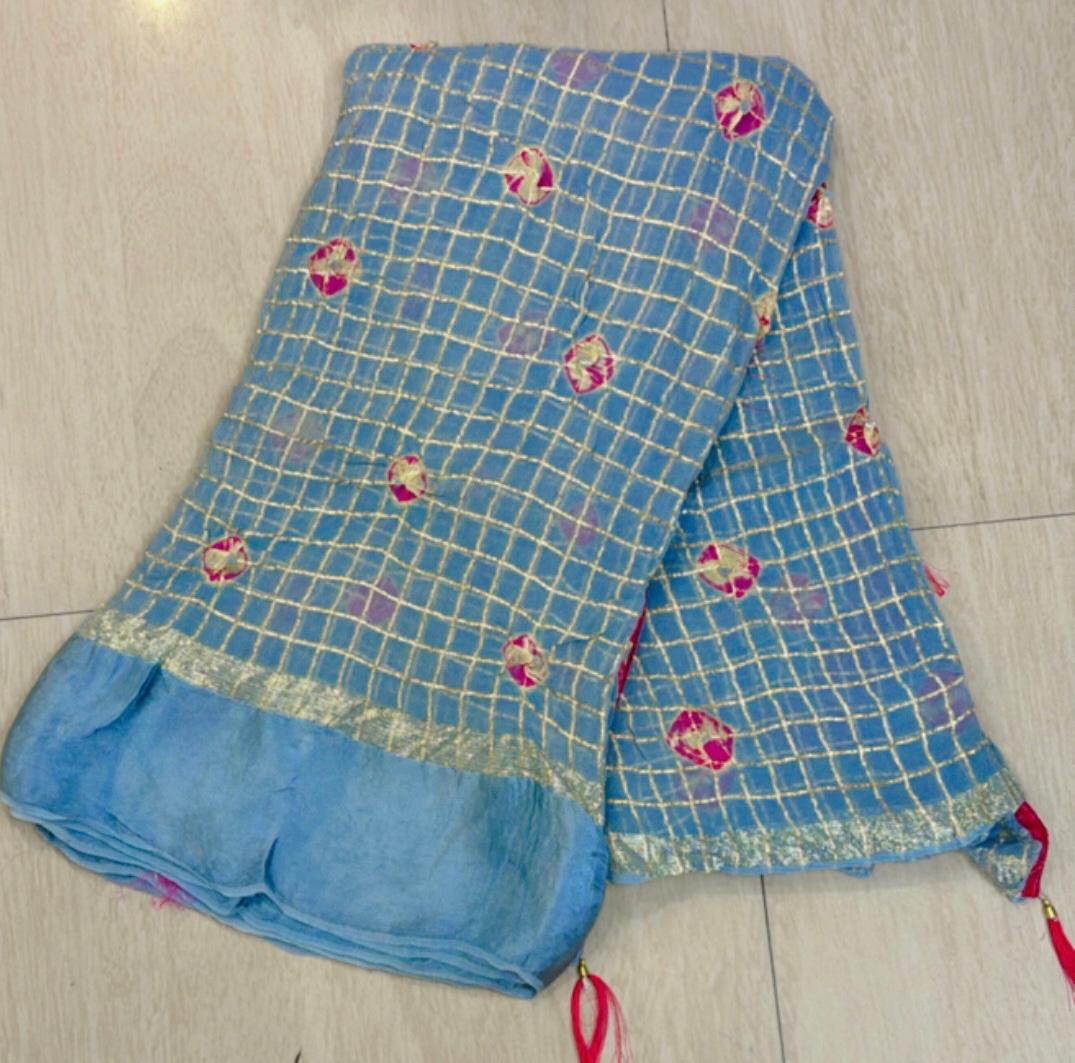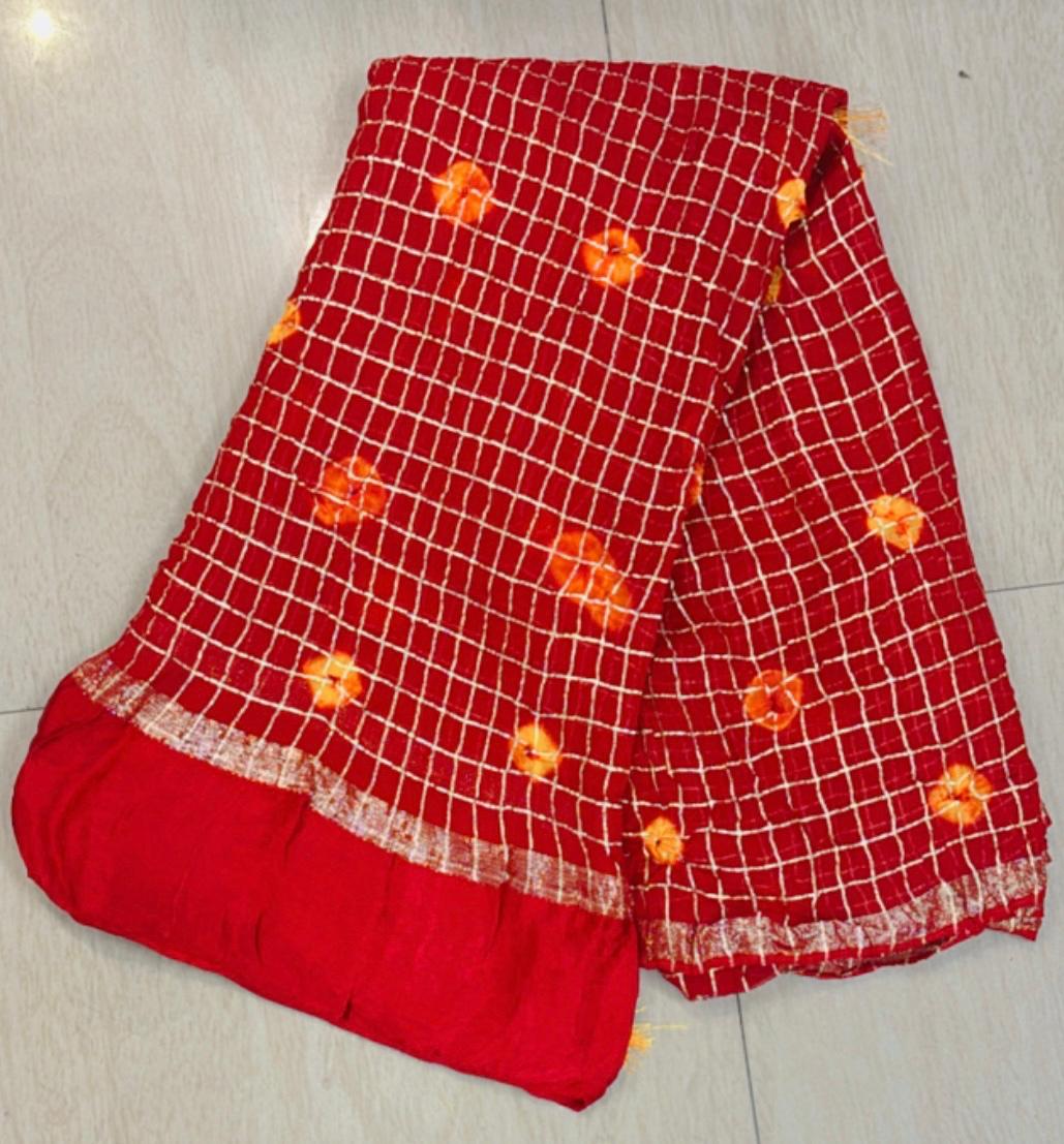 ​Work: Intricate Bandhej print with a checked (jaal) pattern and delicate gota patti border.