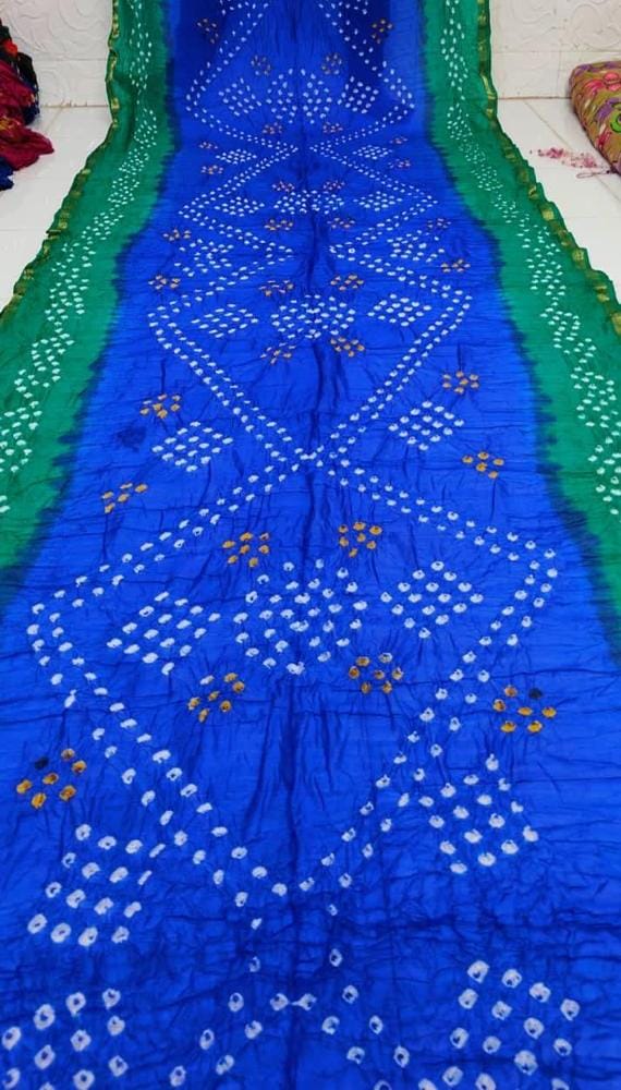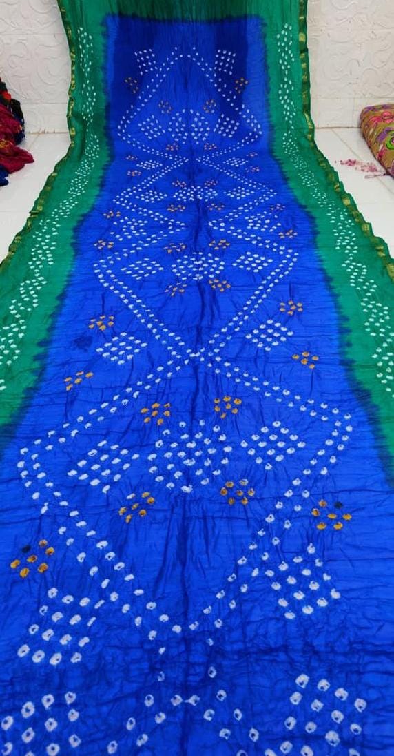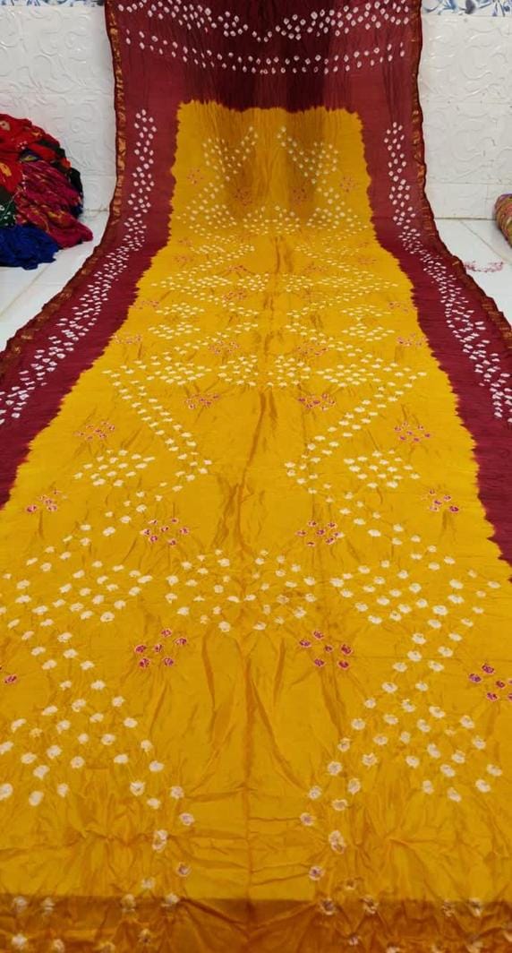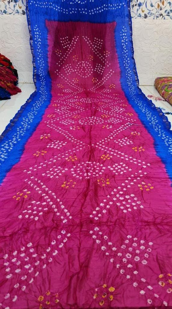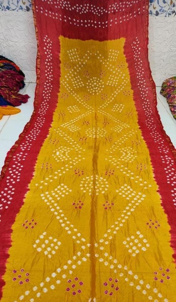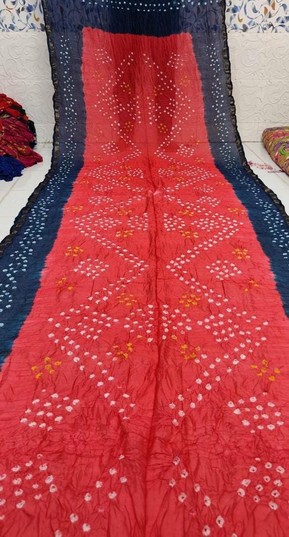 Work: Traditional Bandhej print with intricate Zari and Gota Patti border.