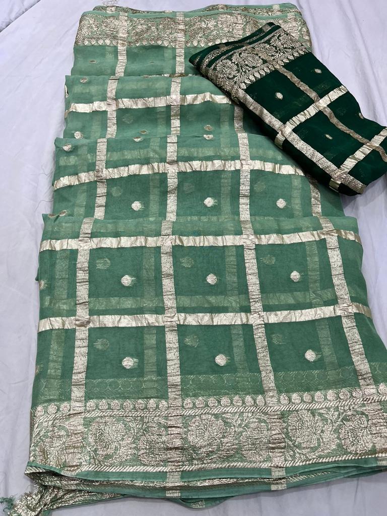 Work: Classic Bandhej print with a checked (Chokda) pattern and a shiny golden border.